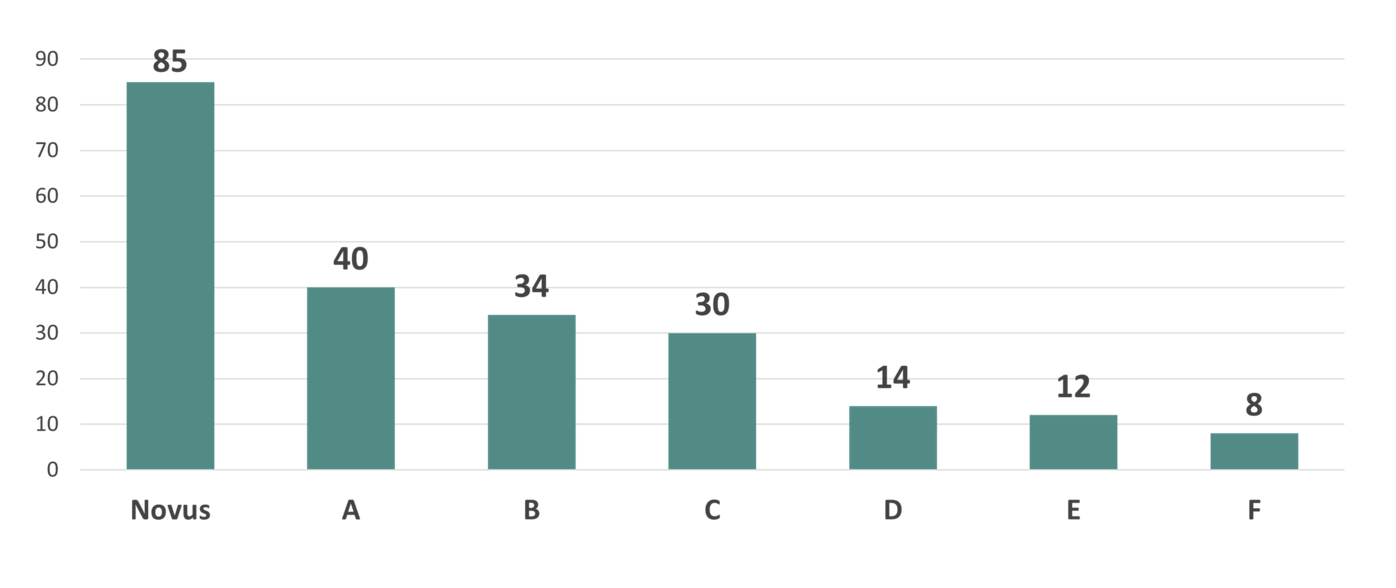 Diagrammet visar antalet omnämnanden av Novus undersökningar i media under datumen 23-27e juni (Almedalsveckan. Siffror hämtade från Retriever). Våra konkurrenter har anonymiserats och är markerade från A till F.