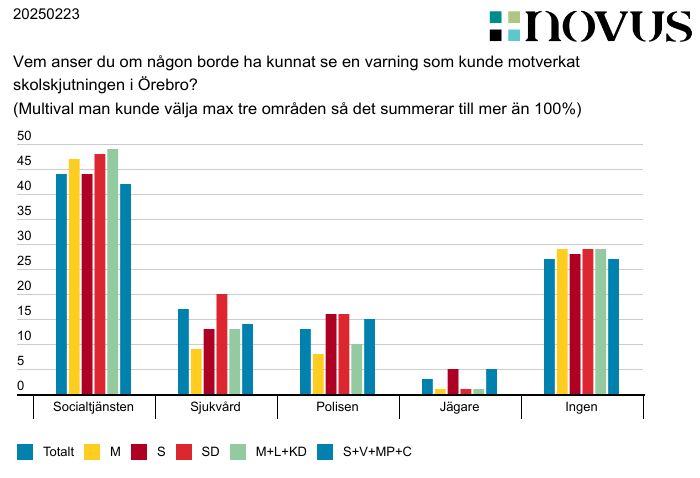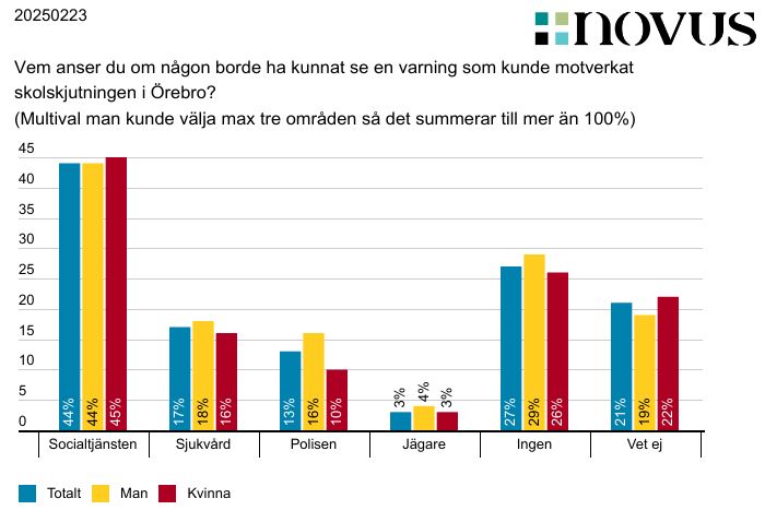 Svenska folket anser att om någon skulle kunnat identifiera en varning som motverkat skolskjutningen i Örebro svarar nästan varannan svensk (44 %) socialtjänsten. 17 % anser att sjukvården borde sett något och 13 % menar polisen. Nästan var tredje svensk (27 %) anser att ingen kunnat se några förvarningar. 21 % vet inte, och 3 % anser att jägarkåren borde sett varningstecken.