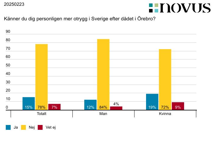 15 % av svenskarna känner sig mer otrygga efter Örebrodådet. 78 % känner sig inte mer otrygga. Det är en relativt väntad nivå, eftersom detta dåd var annorlunda än de skjutningar och sprängningar som skett. Detta innebär däremot inte att befolkningen känner sig trygg, något vi noterat den sista tiden. I januari uppgav nästan varannan svensk, 45 %, anser att de blivit mer otrygga de senaste åren. Kvinnor (51 %) i högre grad än männen (39%) (undersökning från januari 2025: Oro för våldsbrott, vapen för skydd och tvivel på polisens snabbhet).