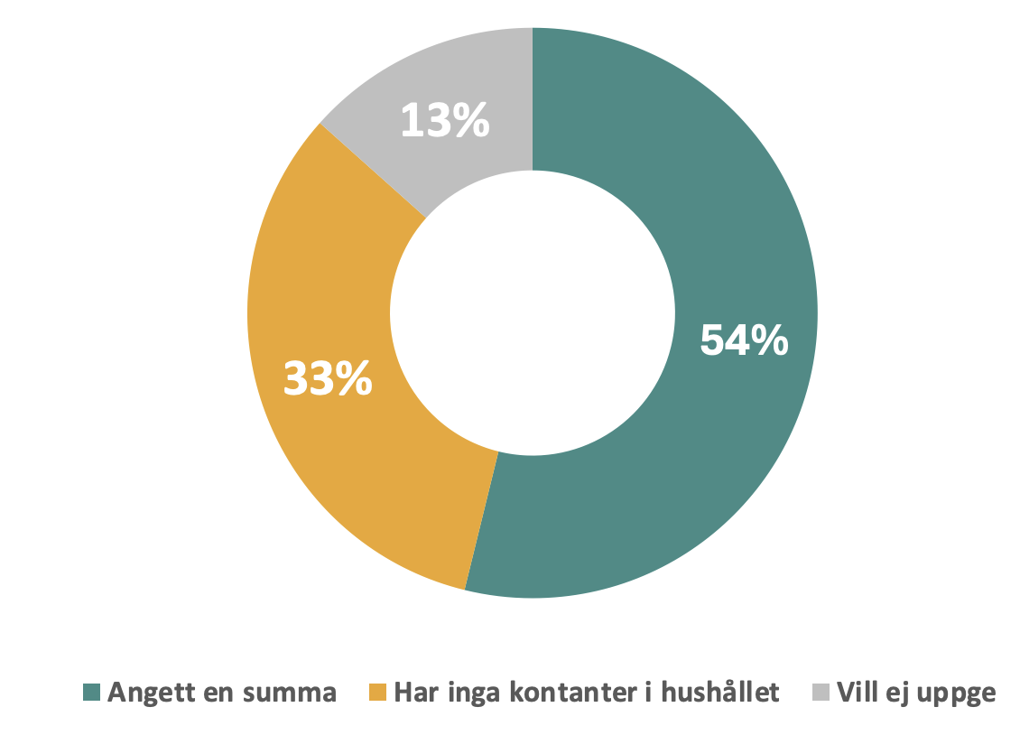 Undersökningen visar också att hushållens egen bedömning stämmer relativt väl överens med verkligheten. De som uppger att de har tillräckligt med kontanter har i median 1 700 kronor per vuxen. Däremot är 25 percentilen 1000 kronor vilket indikerar att det ändock finns personer som angett att de har tillräckligt med kontanter men uppgett en lägre siffra än 1000 kr. Medianen för de som uppgett att de inte har tillräckligt med kontanter hemma är 400 kronor.