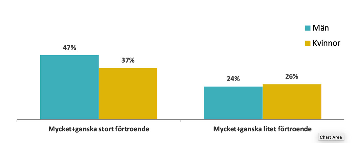 Sett till kön anger nästan hälften av männen (47%) att de har stort förtroende, vilket är en signifikant högre andel jämfört mot totalen. Nästan fyra av tio kvinnor (37%) anger sig ha ett stort förtrende, vilket är signifikant lägre andel jämfört mot totalen. Det är ingen signifikant skilland i andelarna som har litet förtroende