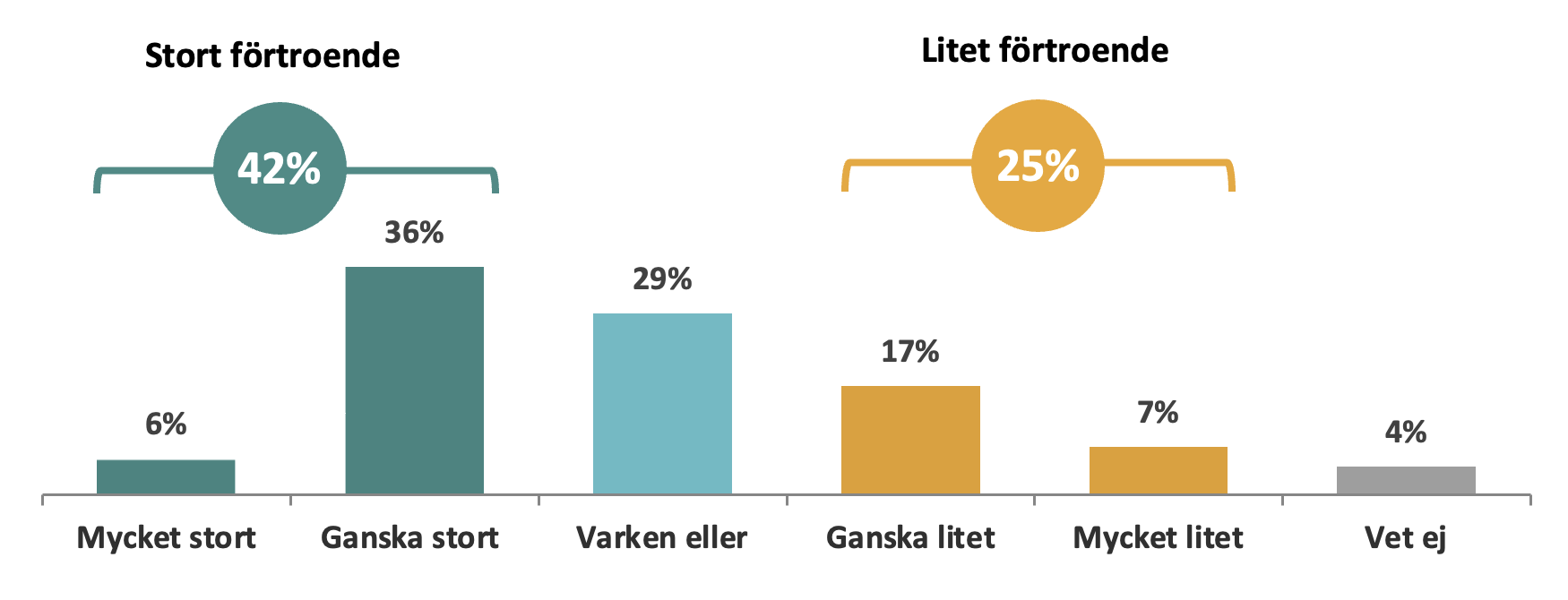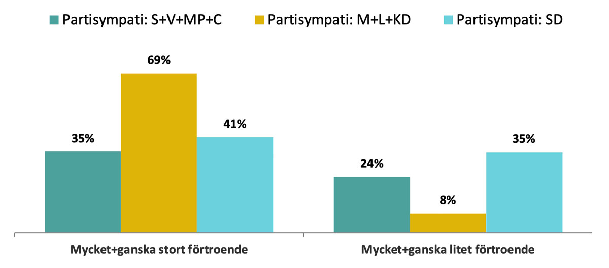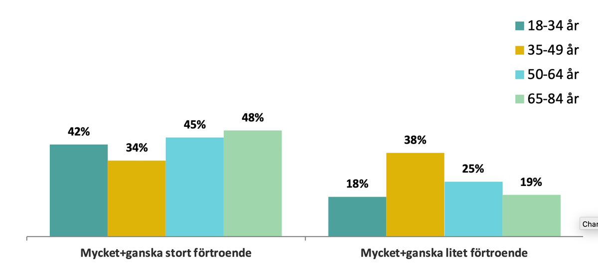 En av tre (34%) i åldern 35-49 år anger att de har ett stort förtroende, vilket är den lägsta andelen av åldersgrupperna. Jämfört mot totalen är den andelen signifikant lägre än totalen. Ser man till andelen hos denna åldersgrupp som angett att de har ett litet förtroende är den nästan fyra av tio (38%), vilket är den största andelen bland alla åldersgrupper. Andelen är även signifikant högre jämfört mot totalen. Ser man till den äldsta åldersgruppen (65-84 år) svarar nästan hälften i denna grupp (48%) att de har ett stort förtroende vilket är signifikant högre jämfört med totalen. Denna åldersgrupp svarar även i signifikant lägre grad att de har ett litet förtroende (19%) jämfört mot totalen. Även yngsta åldersgruppen (18-34 år) svarar i signifikant lägre grad att de har litet förtroende (18%) jämfört mot totalen (25%).