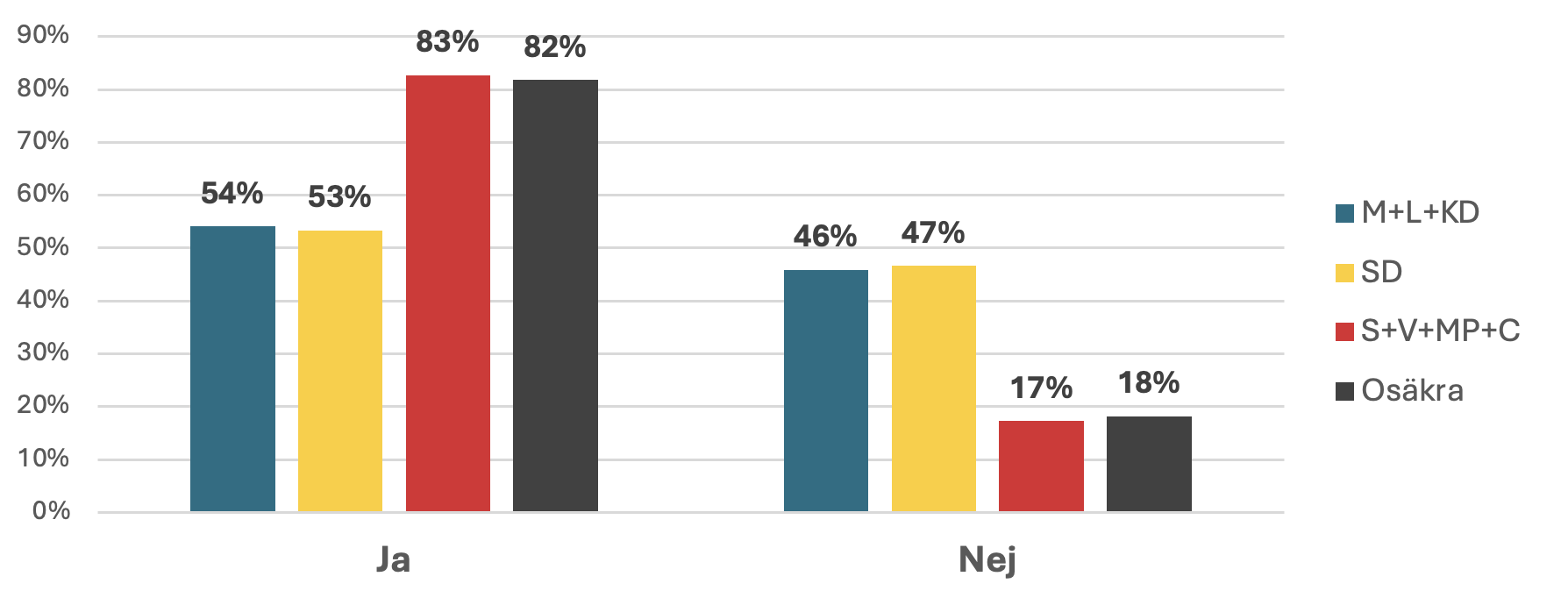 Även uppdelat på partisympati ser man att regeringspartierna och SD:s sympatisörer är mest positiva, och oppositionen mest negativ.