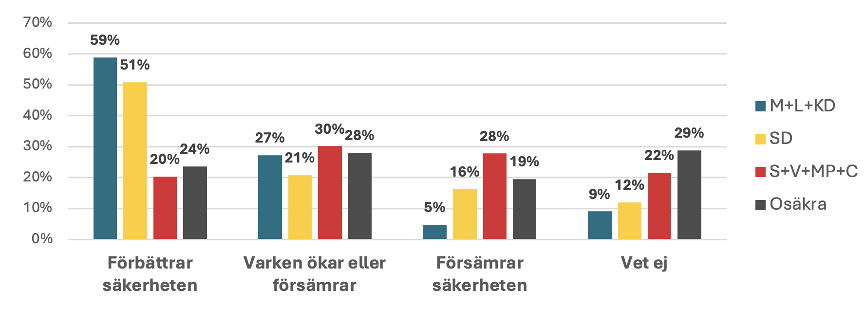 Fördelat på partisympati tror regeringspartiernas och SD:s sympatisörer att det förbättrar säkerheten, men oppositionens sympatisörer är mer åt att det är oförändrat, försämrar eller att man inte vet.