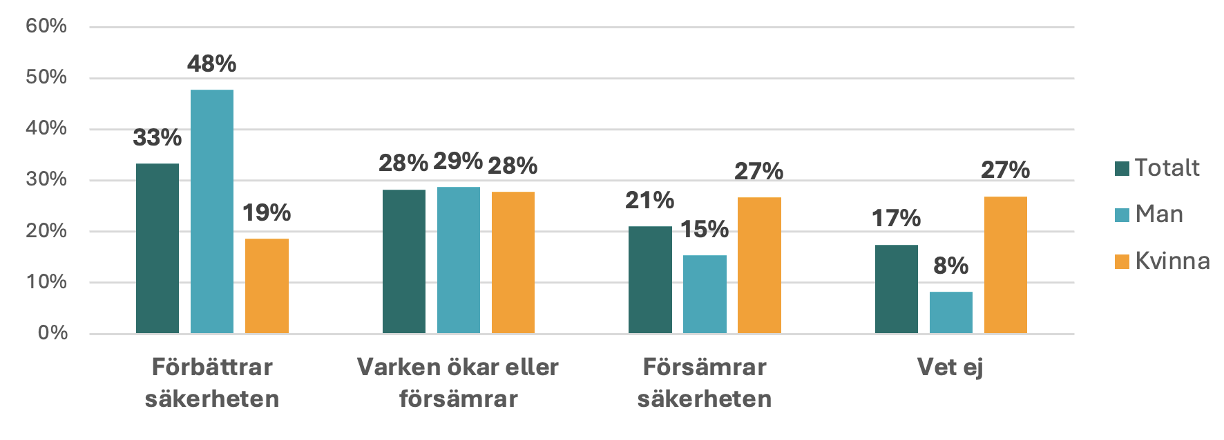 Svenska folket är kluvet även kring synen på europeiska kärnvapen, var tredje tror det förbättrar säkerheten, knappt var tredje att det inte påverkar, och var femte att det försämrar säkerheten. Män tror mer att det förbättrar säkerheten, kvinnor lutar lite mer åt att det försämrar eller kan inte svara på frågan.