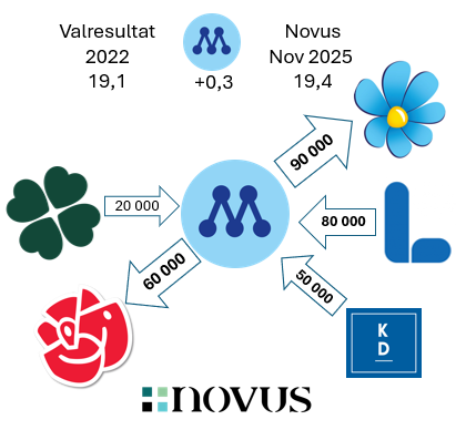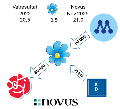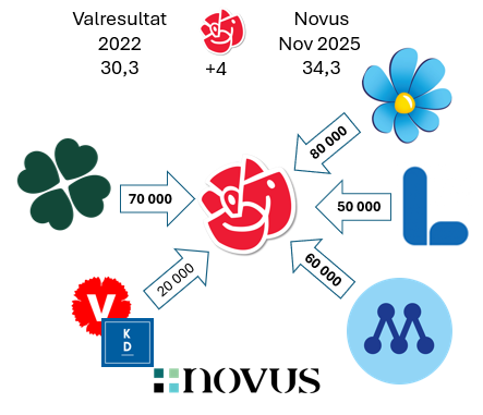 Om vi tittar på de tre största partierna, baserat på Novus senaste väljarbarometer (november 2025), och utgår från hur stora de skulle vara om det vore val idag, ser vi tydliga väljarflöden. Väljarflödena är avrundade till närmaste 10 000 tal, och jag särredovisar här endast förändringar på 20 000 väljare, för att tydliggöra på de stora dragen.
