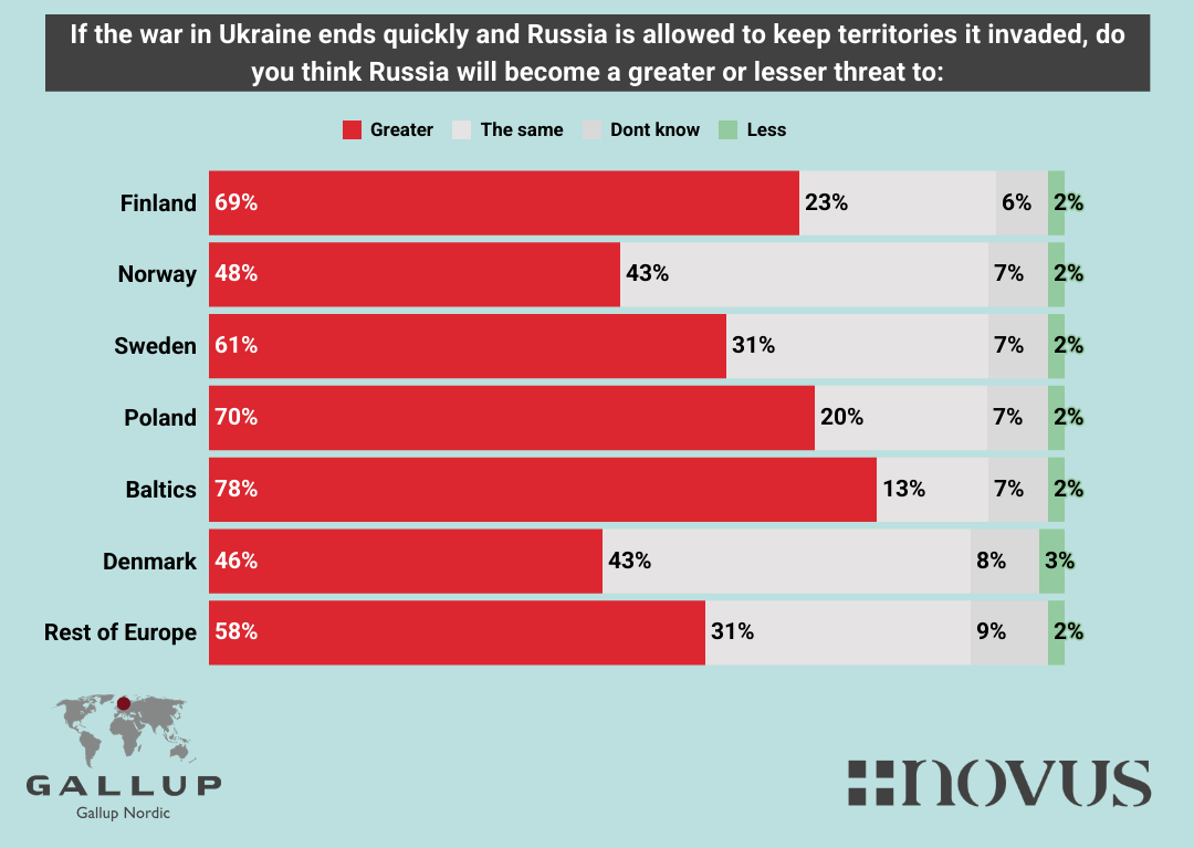 This question was not in Ratings questionnaire, only in our Swedish. It is crystal clear that the swedes see a Russia that will not stop at Ukraine, but a threat to rest of Europe, highest is the Baltics (78%) , Poland (70%), Finland (69%), Sweden (61%), Norway (48%) and lastly Denmark (46%).