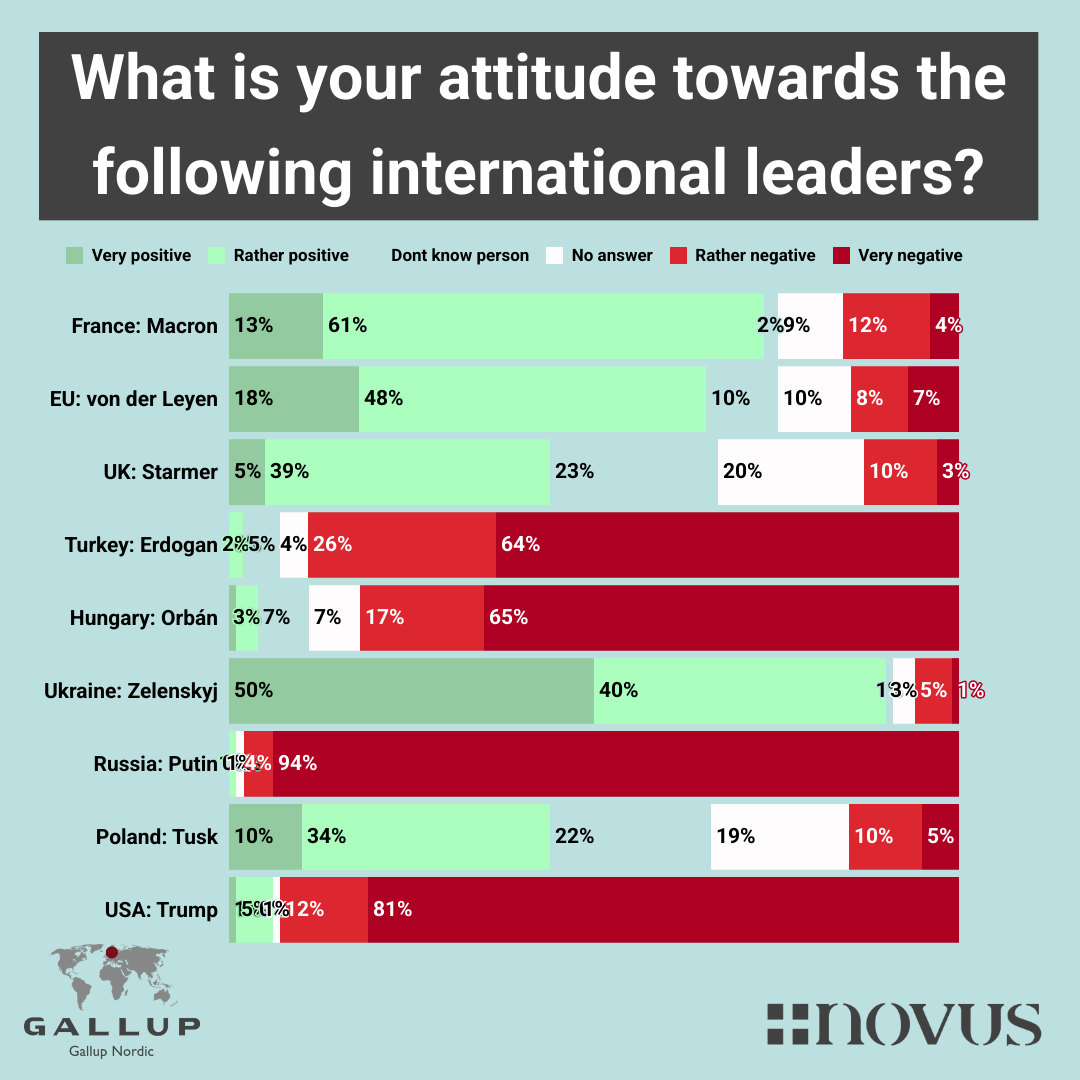 Back to the research results, Ukrainian president Zelensyj is the world leader that has the highest positive view from swedes, 50 % very positive, and 40 % rather positive, totaling to 90 % positive view, in stark contrast to the 90 % negative view that Trump and Putin have in the Swedes eyes.