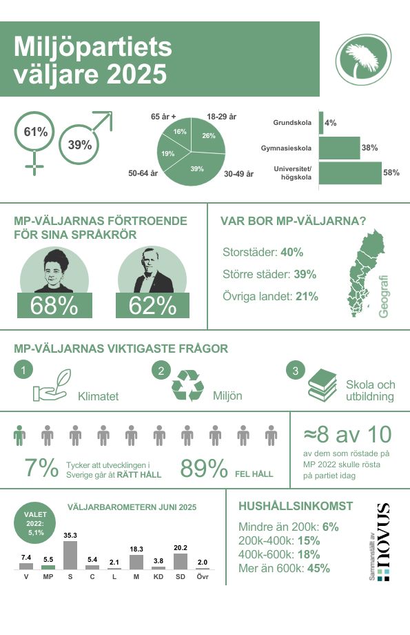 Novus har inför Almedalsveckan 2025 gjort en sammanställning om varje riksdagspartis väljare. Dessa väljarprofiler är baserade på ca 3000 intervjuer kring politiska sakfrågor och den senaste väljarbarometern. Så här ser MP-sympatisören ut idag: