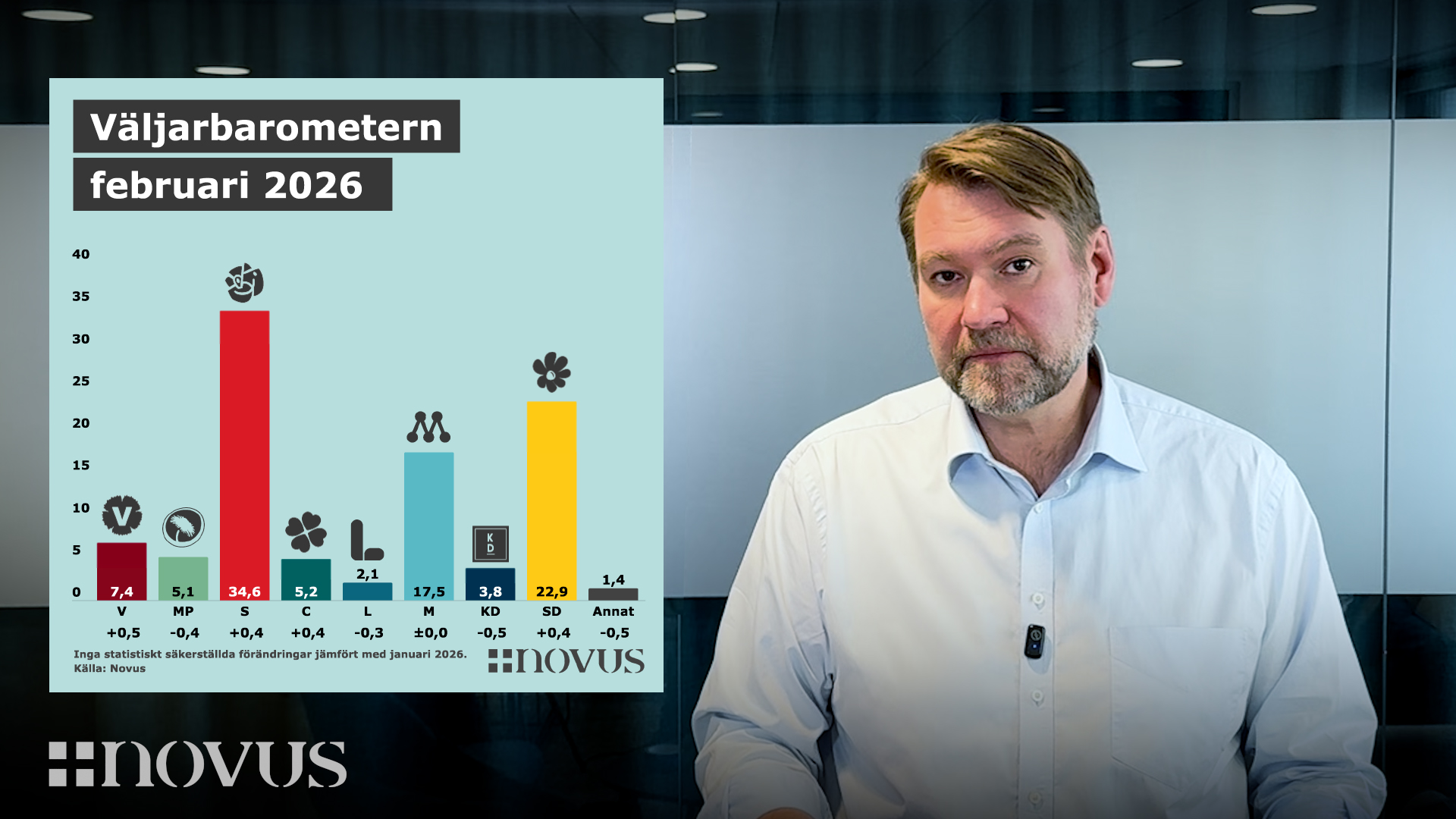 På drygt en minut får du en sammanfattande analys av Novus väljarbarometer för februari 2026. Novus VD Torbjörn Sjöström presenterar de senaste resultaten och beskriver hur opinionen skulle se ut om det vore val i dag.