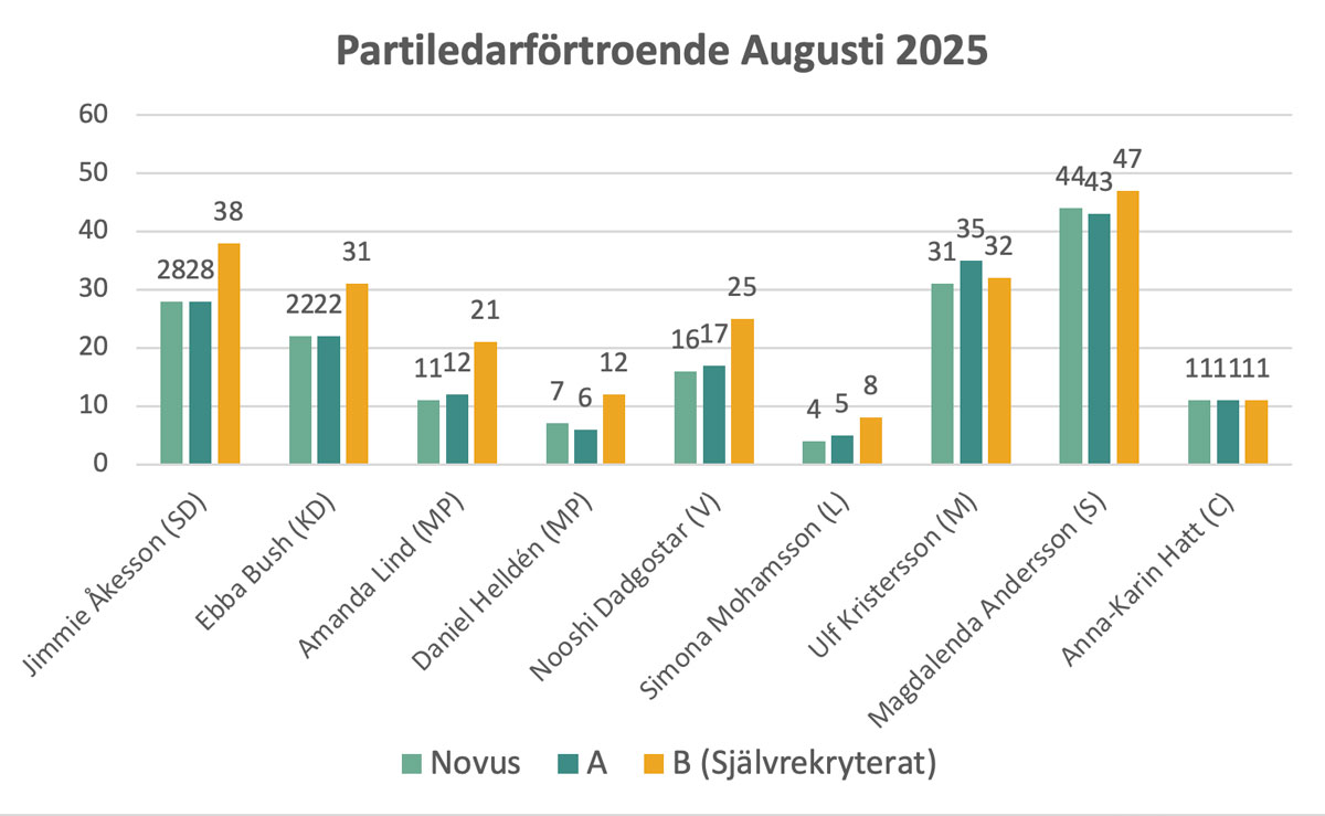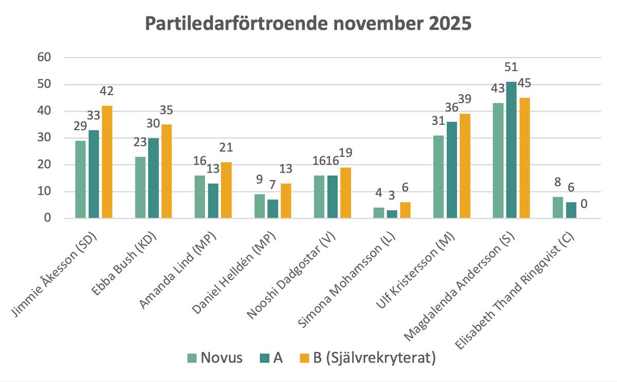 När vi jämför data mellan institut som använder slumpmässiga urval ser vi däremot små skillnader och stabila trender över tid. I november hade de två institut med slumpmässiga sannolikhetsurval exakt samma inbördes ordning mellan partiledarna, vilket visar att rangordningen faktiskt speglar hur svenska folket värderar partiledarna. I mätningen som bygger på självrekrytering avviker framför allt partiledare som väcker starkare känslor, något som är ett av kännetecknen av självrekryterade urval.