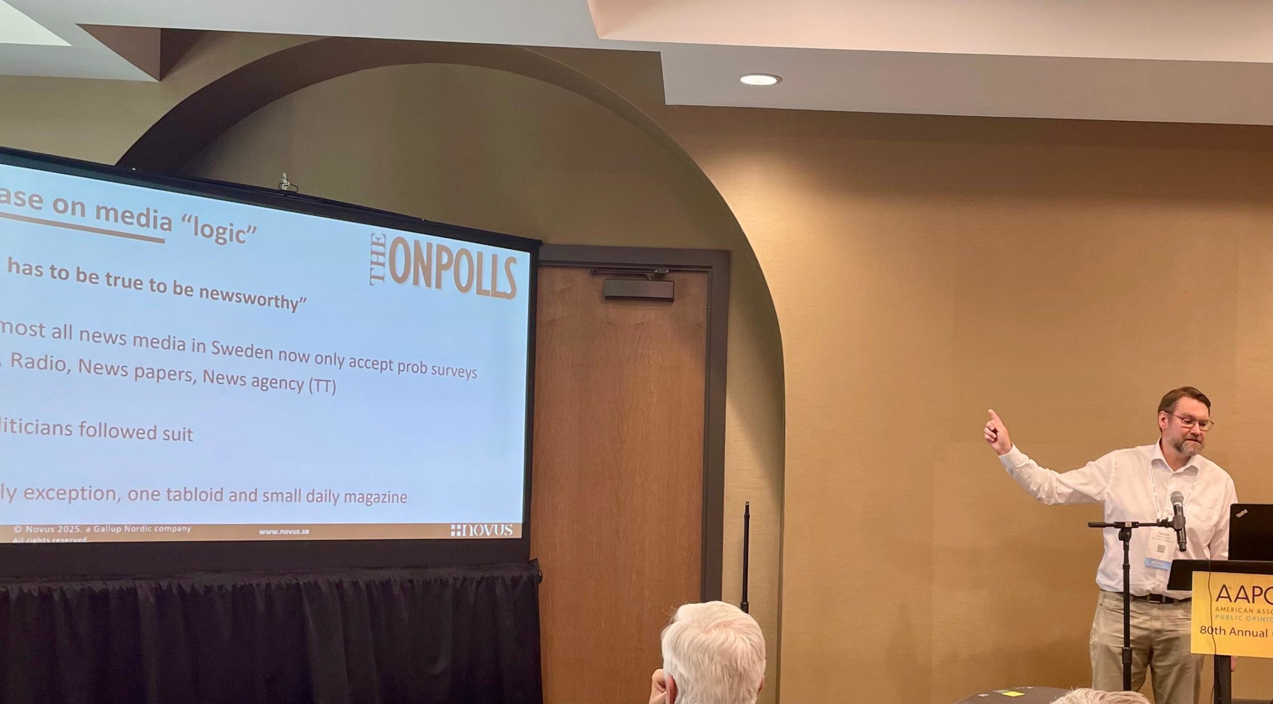 Jag berättade hur vi i Sverige, genom mitt och Novus arbete, lyckats stärka förtroendet för opinionsundersökningar. I snart 15 år har jag utbildat media om vad som skiljer vetenskapliga mätningar från ovetenskapliga. Resultatet? Nästan alla seriösa redaktioner i Sverige förlitar sig i dag på undersökningar baserade på slumpmässiga urval.